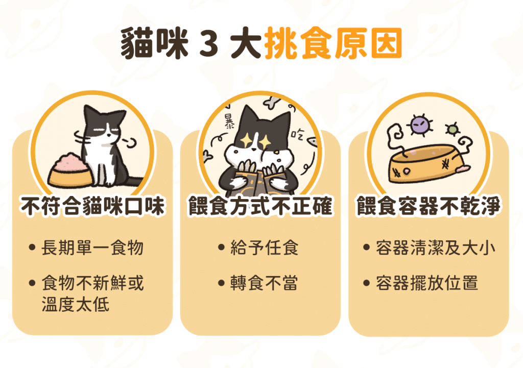 生活專題獅 貓咪挑食怎麼辦?4 招讓挑嘴貓乖乖吃飯! By 小粉獅 / 2025-10-27 你家也有令人崩潰的挑嘴貓嗎?不論是花錢買各種罐頭、親自下廚煮鮮食,或是用零食哄騙,寧可餓肚子也不賞口,甚至昨天愛吃的今天就不吃了。其實,貓咪挑食的背後藏著生理與心理等多重原因,讓我們一起了解成因才能對症下藥。 貓咪是天生愛挑食嗎?(一)先天性挑食幼貓時期受到母貓影響,例如母貓獵捕的食物類型、流浪時期的飲食經驗,都這些偏好會持續保留,且貓咪年紀越大越不願意嘗試新食物。(二)後天性挑食大多數挑食習慣都是後天養成,當貓咪接觸到各式各樣的食物後,就會產生偏好,出現選擇性進食行為。 造成貓咪挑食的常見原因!(一)飲食偏好不符合長期單一飲食:長期吃同一種食物會讓貓咪對其他新食物產生排斥、較難接受改變。食物不新鮮或溫度過低:常見的濕食或鮮食在室溫放超過 20 分鐘可能變質,會讓貓咪認為食物壞掉而拒吃,加上貓咪偏好 25-35℃ 左右的食物溫度,如果低於 25℃,有些貓咪會認為不夠新鮮而不願進食。(二)餵食方式不正確任意飲食:隨時都有食物可以吃會讓貓咪沒有飢餓感、降低進食慾望。轉食不當:突然轉換飲食會讓貓咪感到危機感,進而拒吃。(三)餵食容器不理想因沒有每天洗碗而產生異味、碗的形狀太小讓鬍鬚碰到碗緣、碗的擺放位置靠近貓砂盆或附近有任何異味,都會讓貓咪不想吃飯。 延伸閱讀:貓咪不吃罐頭怎麼辦?掌握5步驟,輕鬆調整乾濕食比例轉食成功!延伸閱讀:貓狗食量計算器:快速算出每日食量、熱量與飲水量延伸閱讀:毛孩的碗比馬桶還髒?正確清潔方法要知道! 貓咪挑食怎麼辦?(一)建立良好飲食習慣定時定量:每天固定放飯和收碗時間、餵食量,改善吃到飽的壞習慣。漸進式轉食:如果換新食物至少需要一週實行漸進式轉食,避免貓咪腸胃不適。(二)改變食物種類與溫度更換食物種類:選擇不同食材的罐頭,讓貓咪多方嘗試。增加適口性:將適量的肉鬆或肉泥等零食拌入食物、增加香氣,或將食物加熱到不燙口的溫度,讓貓咪更願意進食。(三)適當的餵食容器使用較寬的不鏽鋼、陶瓷或玻璃材質的碗,並清洗乾淨。避免使用塑膠材質,容易產生刮痕、殘留細菌。(四)增加活動量每天固定時間陪貓咪玩遊戲,或在吃飯前多互動,讓貓咪消耗體力、促進食慾。 汪喵星球,始終以毛孩為本。我們相信,毛孩就和小孩一樣,值得擁有最優質的選擇。因此,我們始終以毛孩的需求為出發點,從主食、零食、保健品到貓砂,持續打造極致、提供上百款貼近需求的產品,帶給毛孩幸福又健康的生活。汪喵星球更希望透過每一次的日常觀察,幫助毛拔麻了解毛孩喜好,讓毛孩過得更好,陪我們一起慢慢變老! 節錄自《貓咪挑食不吃飯?4 招改善挑食壞習慣,讓挑嘴貓不挨餓、自動吃》。由汪喵星球授權轉載。 2025指定通路刷卡1.5%現金回饋 立即了解更多 Tags: 生活時事 You may also like 買房必看!掌握銀行鑑價,用對方法買房省百萬 By 小粉獅 / 2025-10-15 2025低自備款買房必讀指南:自備10萬就能進場真的可行嗎? By 小粉獅 / 2025-10-12 從首購到換屋必懂!10 招看房心法,幫你找到最適合的家 By 小粉獅 / 2025-10-08 貓咪也有分離焦慮?了解可能原因、3 招緩解獨處焦慮! By 小粉獅 / 2025-09-29 毛孩用屁股磨地板?3 個磨屁屁原因大公開! By 小粉獅 / 2025-09-22 文章導覽 要存到多少錢,才夠用到老?思考 3 件事,找出你的「財務自由數字」