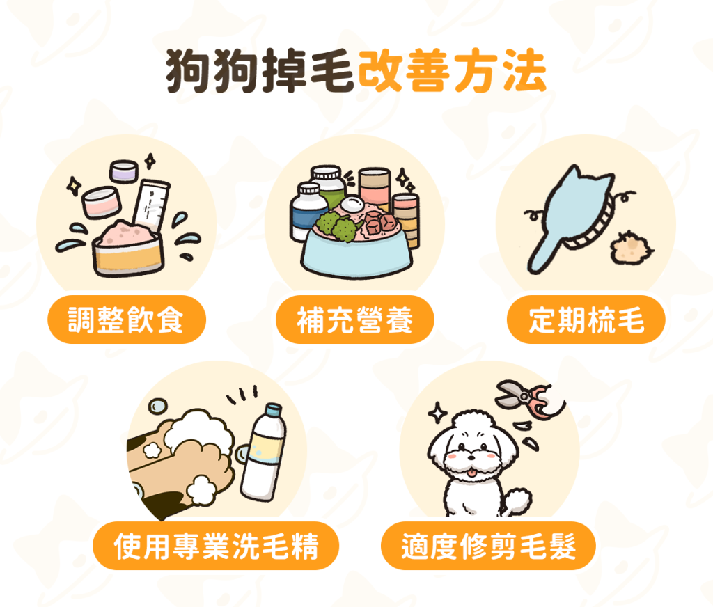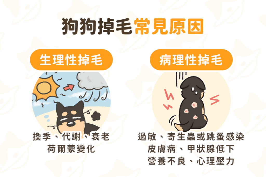 生活專題獅 狗狗一直掉毛怎麼辦?8 個常見原因與飲食改善方法! By 小粉獅 / 2025-10-29 造成狗狗掉毛的常見原因!(一)生理性掉毛新陳代謝:狗狗的毛髮會隨著代謝自然脫落。只要毛量和皮膚狀況正常,通常不用太擔心。換季:春、秋兩季是狗狗的換毛旺季,這是為了適應天氣變化的自然現象。荷爾蒙變化:發情、懷孕或哺乳期的狗狗,掉毛量會增加。只要飲食、精神和皮膚狀況正常,通常會自然恢復。衰老:老年期的狗狗,毛髮會變得脆弱、稀疏和失去光澤,這是自然老化現象。(二)病理性掉毛過敏:食物、塵蟎或花粉過敏,會引起搔癢進而導致掉毛。寄生蟲感染:跳蚤、虱子等寄生蟲感染,會引起搔癢且伴隨局部或全身皮膚紅腫等症狀,進而出現局部掉毛或禿斑。皮膚病:黴菌感染、濕疹、異位性皮膚炎等疾病,都會引起搔癢進而導致掉毛。甲狀腺低下:甲狀腺低下症會導致新陳代謝變慢,進而引起體重增加、行動遲緩、心跳過慢,或是掉毛現象。營養不良:飲食過鹹、過油或缺乏必要營養素,會影響皮毛健康,導致掉毛現象。心理壓力:缺乏陪伴、增加新成員、改變環境等情況,都會導致壓力過大,進而引起食慾不振或掉毛現象。 延伸閱讀:狗狗會對雞肉過敏?狗狗皮膚搔癢難改善?小心食物過敏延伸閱讀:貓咪驅蟲藥推薦|寵愛滴劑、全能貓、一錠除功效與副作用比較延伸閱讀:認識狗狗皮膚病!常見的狗皮膚病種類、治療一次看 狗狗一直掉毛怎麼辦?定期梳毛:每天或每週定期梳毛,可以去除舊毛、死毛並促進血液循環,減少毛髮掉落。使用專用洗毛精:選擇溫和不含刺激成分的寵物專用洗毛精,能夠有效清潔同時保護天然油脂層,避免皮膚乾燥和掉毛問題。切勿使用人類洗髮用品。適度修毛:毛量過多或長毛的狗狗,可以適度修剪毛髮。切勿剃光。調整飲食:易過敏體質的狗狗,可以嘗試逐步測試並移除過敏食材。補充營養:除了均衡飲食,可補充有助皮毛健康的營養品,幫助維持毛髮光澤。 汪喵星球,始終以毛孩為本。我們相信,毛孩就和小孩一樣,值得擁有最優質的選擇。因此,我們始終以毛孩的需求為出發點,從主食、零食、保健品到貓砂,持續打造極致、提供上百款貼近需求的產品,帶給毛孩幸福又健康的生活。汪喵星球更希望透過每一次的日常觀察,幫助毛拔麻了解毛孩喜好,讓毛孩過得更好,陪我們一起慢慢變老! 節錄自《狗狗掉毛嚴重?狗狗一直掉毛原因與 5 大改善方法》。由汪喵星球授權轉載。 momo購物網 筆筆回饋~ 立即了解更多 Tags: 生活時事 You may also like 貓咪挑食怎麼辦?4 招讓挑嘴貓乖乖吃飯! By 小粉獅 / 2025-10-27 買房必看!掌握銀行鑑價,用對方法買房省百萬 By 小粉獅 / 2025-10-15 2025低自備款買房必讀指南:自備10萬就能進場真的可行嗎? By 小粉獅 / 2025-10-12 從首購到換屋必懂!10 招看房心法,幫你找到最適合的家 By 小粉獅 / 2025-10-08 貓咪也有分離焦慮?了解可能原因、3 招緩解獨處焦慮! By 小粉獅 / 2025-09-29 文章導覽 第一銀行INSTAGRAM日常抽獎 活動辦法(24小時限定鐵粉能力測驗)