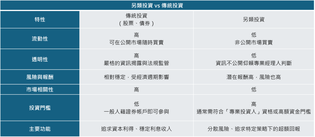 投資理財 財經時事獅 另類投資是什麼?有錢人都在投?怎麼選購? By 小粉獅 / 2025-11-17 「當你看到市場上所有人都往同一個方向衝,你就要小心了。」在電影《大賣空》裡,這句台詞精準道出了另類投資的精髓 。電影中 Micheal 就是擔任對沖基金經理人,預見次級房貸會壓垮美國未來房市,並投入高達十億美元與當時華爾街投行對賭,在 2005 年房市正火熱時做空 CDO。在之後的三年,他不斷承受市場壓力與追繳保證金的考驗,但當 2008 年金融風暴引爆,美國房市瞬間崩塌,Micheal 的基金逆勢大漲,報酬率高達 489 %。這段故事揭示了:另類投資之所以引人注目,就在於它往往能在傳統市場之外找到突破口。接下來,就讓股感帶大家走進另類投資的世界,一起看看它如何在動盪市場中創造超額回報。 什麼是另類投資?另類投資(Alternative Investment)是一個廣泛的資產類別,顧名思義,凡是不屬於現金、股票、債券這類傳統投資工具都可以被歸在這一塊。從金融性的衍生商品到實體資產,例如藝術品或房地產,都算是其中的一環。因為這些投資標的走的是「非傳統路線」,它們和一般市場的連動性往往比較低,所以不少人會利用另類投資來分散風險。不過話說回來,這條路並不是沒有挑戰:資金流動性不足、透明度不高,再加上價格波動大,意味著投資人需要有更強的風險承受力。 另類投資 vs 傳統投資看到這邊是不是對另類投資還一頭霧水?沒關係股感在這邊幫你準備了圖表,讓你快速了解另類投資跟傳統投資差別! 另類投資有哪些產品?對沖基金對沖基金(Hedge Funds)本質就是一種私募基金,透過靈活運用多種策略來分散風險,爭取正報酬。其作法很多元,常見的操作方式包括多空操作、套利、以及槓桿借貸等,目的就是讓基金在不同的市場景氣循環裡,都還能找到獲利的機會。不過在台灣,投資人想要直接參與對沖基金並不容易。但換個角度來看,許多「多重收益型」或「組合型基金」裡,其實就已經偷偷融入了對沖基金的策略,讓一般投資人也能間接體驗這類靈活的操作方式。私募股權私募股權(Private Equity)簡單來說,就是把資金投入到還沒上市的公司。它的範圍很廣,從投資新創公司的創業投資(VC),到收購成熟企業的槓桿收購(LBO),都屬於這個領域。近幾年,台灣的私募股權市場其實發展得相當快。2020年總投資額創下37億美元的歷史新高,顯示這個領域已經逐漸成為資本市場不可忽視的一股力量。私募信貸私募信貸(Private Credit)這幾年在全球投資市場中快速冒起。它的做法很直接:由非銀行的金融機構把錢借給企業,來補上傳統銀行無法滿足的融資需求。對投資人來說,因為必須承擔「資金流動性不足」的風險,回報率也往往比一般市場高一些。更特別的是,私募信貸和股票、公開債券市場的連動性相對較低,再加上許多貸款設計成浮動利率,不僅能幫助投資組合分散風險,也能在通膨環境下提供一定程度的防護。這讓它逐漸成為資產配置裡不可忽視的新選項。實體資產實體資產是「摸得到、看得見」的資產。它的價值來自稀缺性、使用價值,甚至是歷史意義,因此與金融市場的漲跌連動性通常較低。一般來說,實體資產可以分為大宗物資(像是石油、黃金、藝術品)和不動產兩大類。在不動產投資裡,最常見的形式就是 REITs(不動產投資信託)。透過 REITs 投資人不用自己買大樓或商場,也能間接參與不動產市場,分享商辦大樓、購物中心、倉庫、甚至酒店帶來的租金收入,並期待資產未來的增值。不過,回到台灣市場,REITs 的發展相對保守。受到監管限制影響,規模偏小、吸引力不足,因此相比鄰近的日本,這類投資在台灣仍未能真正打開大眾市場。 要如何參與另類投資?在很多人的印象裡,「另類投資」總是動輒要準備上百萬美元的門檻,彷彿只屬於金字塔頂端的遊戲。但其實並非如此。對一般投資人來說,REITs 就是一個相對親民的入門選擇,價格不高、回報也算穩定。目前台灣正在推動修法,讓 REITs 的投資標的不再侷限於商辦或賣場,而是擴展到資料中心、醫療機構,甚至再生能源用地,未來殖利率也有望因此提升。眼下台灣市場上共有六檔 REITs:富邦一號:投資商辦和賣場國泰一號:投資商辦及飯店富邦二號:主要投資商辦國泰二號:主要投資商辦圓滿一號:投資商辦和賣場樂富一號:投資商辦和賣場至於私募基金與對沖基金,則是完全不同的世界。因為具備「私募」屬性,它們只針對符合法規的專業投資人或高資產客戶募集,並不對一般大眾開放。投資門檻通常要上看數千萬元的淨資產,或至少數百萬美元的最低投資金額。加上高風險、低流動性與資訊不透明等特性,使得法規需要特別保護一般投資人,以避免不必要的虧損。 可以如何選擇另類投資?評估另類投資,不能只看高回報,更要看它獨特五個重要面向:1. 團隊與策略基金的核心在於投資策略與團隊能力。你需要了解基金是專注新創還是收購成熟企業,並評估團隊過去的成功經驗和專業能力。基金的成敗,最終取決於管理人的決策。2. 歷史表現評估基金的過往成績,不僅要看回報率,還要看回報的穩定性和籌資能力。這能幫助你判斷基金是否能持續創造價值,而不是曇花一現。3. 費用結構私募股權基金的費用通常較高且複雜。除了每年收取的管理費,還有從利潤中抽成的績效費。這些費用會直接影響最終收益。4. 投資標的狀況由於私募投