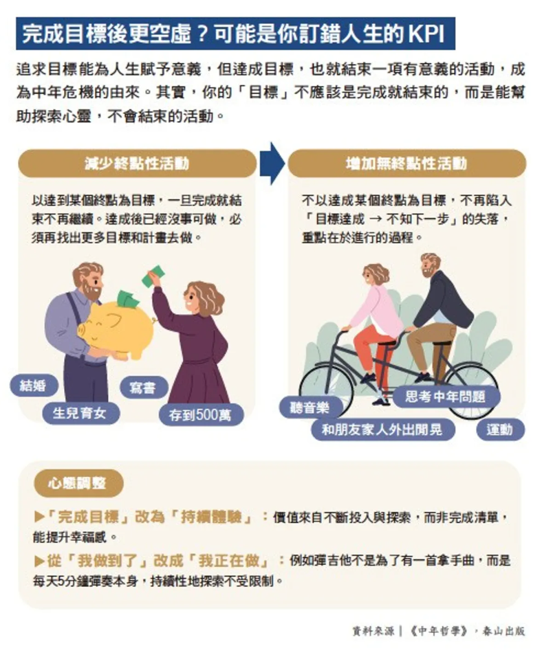 職場生存獅 有讓人稱羨的工作和生活,為何還是不快樂?擺脫 KPI 思維,讓內心告訴你該過什麼日子 (圖/pexels) By 小粉獅 / 2025-11-23 《無路之路》作者、暢銷書作家保羅.米勒(Paul Millerd)堪稱是人生勝利組,名校畢業、擔任麥肯錫(McKinsey & Company)顧問,年薪高達 20 萬美元。2017 年他卻決定辭職,和老婆、女兒展開數位遊牧生活,來到台灣定居。為什麼脫離令人稱羨的工作和組織?外界或許會說,是因為他財務自由了,所以選擇自由的生活。但更真實的原因,是因為他對看似人生勝利組的地圖,感到不滿足。他發現,按照社會期待的路徑走,並沒有想像中快樂。外公的離世讓他開始思考:「我為了什麼而活?」逐漸明白,這條路不是自己要的,於是開始探索其他可能。 列出發自內心熱愛的事,進行「讓生活更美好」的活動很多人和米勒一樣,到了中年開始迷惘。明明擁有一切,為什麼還是不快樂?《覺醒中年》提到,多數人早年的決定是被父母、老師等周遭環境影響,走上被安排好的成功之路。而學校教育一向以功能和性向區分,讓就業成為教育的首要目標,因此,很多人成長過程中,沒有機會好好去想:自己到底喜歡什麼?想過什麼日子?人生有大大小小的 KPI 要完成:升學、就業、升遷、結婚、生子、買房,達成目標是首要任務。一直到了中年,孩子逐漸長大,人生已經沒有KPI要達成時,中年危機便悄然浮現。《重啟人生》點出,這陷入了一種循環,把自我價值建立在「成功目標」上,會為了得到滿足感,不斷追求勝利,一旦停下來,就感覺目標喪失,許多人甚至會陷入憂鬱的情緒中,想著:難道我的人生就這樣了?《中年哲學》建議應該重新思考,什麼能為自己帶來真正的快樂、人生重要的事情是什麼?舉例來說,列出你覺得最重要的 5 件事,可能是健康、陪伴家人、創造力或學習。問問自己,現在的生活做到了哪些?如果沒有,找時間填進這些事,先做出一點小小的改變。其次,進行讓你覺得「人生更美好」的活動,這些活動跟賺多少錢、績效高低無關,純粹是讓生命更有滋味。比方你可能從小喜歡唱歌,讀書時因為要準備考試,沒有加入合唱團,現在下班後參加音樂社團,雖然比賽不會得名,更不可能有額外收入,但每次排練都讓你感到療癒。這還帶來一個好處,透過參與活動,建立與同好社群的連結,有助於破除生活的停滯感。《無路之路》提到,透過網路社群或實體聚會,找到和自己同一掛的人,能夠互相提供支持,對於有熱情的事,愈分享會愈快樂。 傾聽「這才是我」微小聲音,透過逆向思考找線索《覺醒中年》認為,重拾生命的主導權,是人生下半場的首要課題。我們的內在聲音很多,需要釐清哪一部分是屬於自己。這不代表每個人都要和米勒一樣辭職、遠赴異國,用劇烈改變證明自己。可以透過日常練習,慢慢摸索,找出真正屬於自己的聲音。提供生命意義的,不是滿足「人生勝利組」的標準,是內心那股「正確感」,做了之後覺得「這才是我」的微小聲音。如果對現況真的很不滿,想來一場大變化,《無路之路》認為「迷你退休」也是探索的另一種方法。意思是把原本留到 20 年後的退休生活,重新分配到整個人生。例如安排幾個月的旅遊,到不同地方旅行或嘗試新的生活方式,重點是啟動探索的過程。此外,也能用「逆向思考」來盤整現況。像投資大師查理.蒙格(Charlie Munger)提到,「要得到幸福,先想像一個『不幸的人生』會有哪些要素,然後努力避開。」因此,不妨試著寫下一個「負面版本的自己」,或許能從當前生活中發現一些線索,從中做出改變。 (圖/經理人) >>本文經<經理人>同意轉載。 【第一銀行 X 中華電信Hami Point】Hami鬥陣iLEO!最高享2,200點Hami Point 立即了解更多 Tags: 職場學 You may also like 迷惘是遇見嚮往的起點 By 小粉獅 / 2025-11-09 當成功不再等於快樂:或許我們需要走一條《無路之路》 By 小粉獅 / 2025-10-24 大腦工作有黃金時段?專家公認「最佳作息表」6個時間點提神醒腦還容易瘦 By 小粉獅 / 2025-09-28 職場迎來高壓、高淘汰的新常態!「被 AI 取代」的焦慮有解嗎? By 小粉獅 / 2025-09-05 不必做到完美,只要持續就會進化 By 小粉獅 / 2025-08-22 文章導覽 揭開 AI 幻覺的真相:為何語言模型會一本正經地胡說八道?第一銀行INSTAGRAM日常抽獎 活動辦法(J人與P人的旅遊)