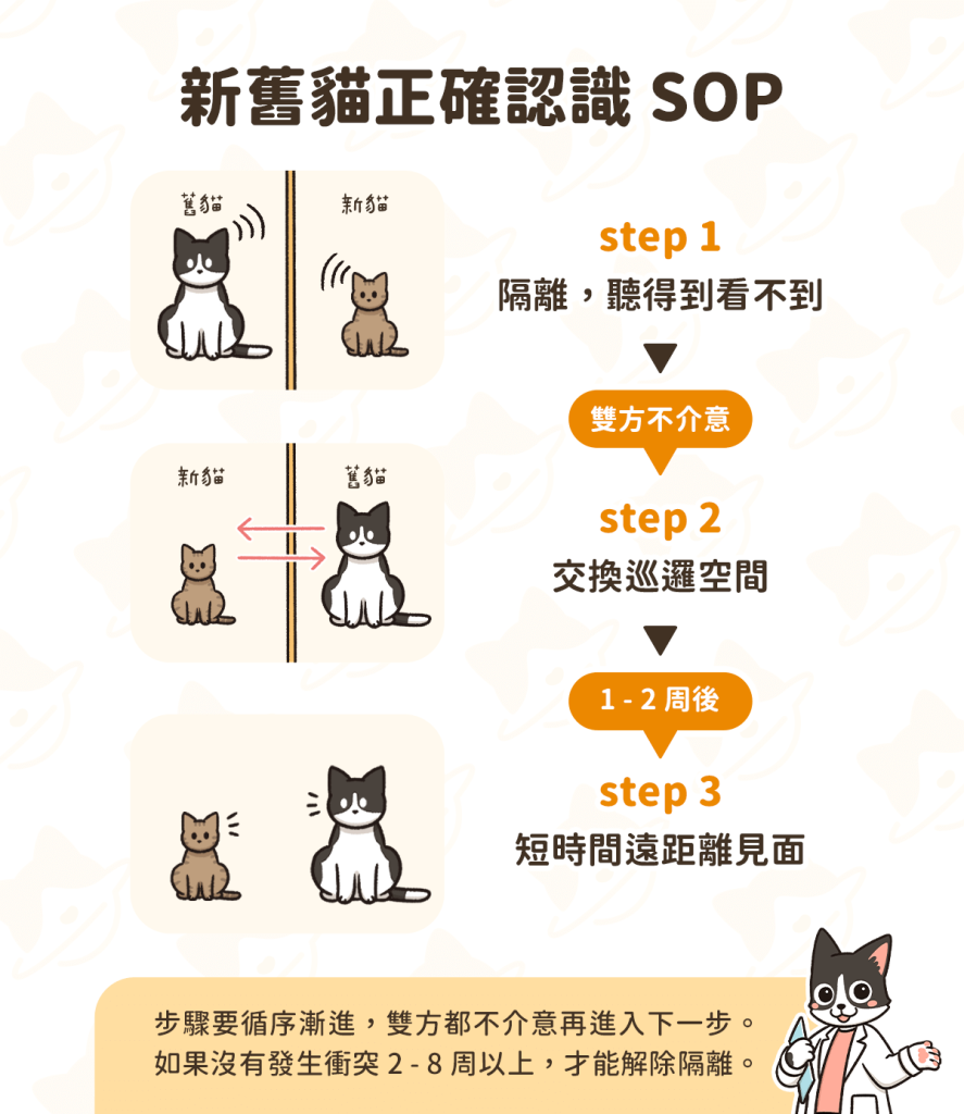 生活專題獅 如何讓兩隻貓和平相處?養第二隻貓必看 SOP! By 小粉獅 / 2025-12-05 想再多養一隻貓,卻擔心新舊貓見面變成「貓咪戰爭」嗎?如果介紹方式不對,很可能讓牠們從此水火不容!汪喵星球特別邀請 專業寵物行為訓練師 – 單熙汝 分享如何用正確的流程讓新舊貓和平相處! 養第二隻貓要隔離多久?3 步驟慢慢來!掌握核心原則:一次只給一種感官刺激 —— 先聽、再聞、最後見面。 STEP 1. 聽帶新貓回家後直接安置到隔離空間,這是最不刺激舊貓的方法。舊貓會察覺到新貓的聲音和味道,進而影響睡眠食慾,也會經常檢查新貓房間門口,確認新成員的友善程度。這時需要維持與舊貓原有的互動和生活習慣,讓牠盡快恢復安心。STEP 2. 聞當雙方都不太在意彼此的聲音、願意正常吃飯和玩耍後,就能更進一步熟悉。至少每天 2 次、1 次數 10 分鐘,讓新舊貓交換巡邏空間,並持續 1 至 2 週的時間,除了認識彼此的味道,也能自然地融合氣味。STEP 3. 見面當雙方熟悉且氣味結合後,就能見面。初次見面至少保持 2 公尺安全距離,只需 1 至 3 秒,創造一個短暫且無衝突的第一印象。隨著貓咪不再緊盯對方、可以各自活動,再視情況逐步增加 5 至 10 分鐘的見面時間,讓新舊貓熟悉彼此,直到成為互不干擾的存在。 延伸閱讀:【訓練師小教室】打造舒適貓宅!理想養貓空間規劃指南如何讓兩隻貓和平相處?3 雷區要小心!其實多數貓咪能避就避,傾向不主動起衝突。只要毛拔麻不過度干涉,牠們往往會自己摸索出和平相處之道。(一)抱著見面直接抱著貓咪或用牽繩去見另一隻貓,會限制貓咪逃跑或溝通的自主權,造成極大刺激、加深緊張情緒。(二)過早交換氣味急著用襪子塗抹、交換雙方氣味,也會加劇緊張情緒。通常需要確認新貓已經適應新環境、舊貓完全恢復到原有的放鬆生活後再進行。(三)共享零食兩隻不熟悉的貓咪近距離吃肉泥,會讓牠們誤以為對方在搶奪資源,反而吃得焦慮不安。 延伸閱讀:貓咪焦慮怎麼辦?訓練師教你 3 步驟正確紓壓2 至 8 週以上沒有衝突,才能順利解除隔離!養第二隻貓咪,想讓兩隻貓和平相處,必須循序漸進。每個步驟都要確認雙方表現不緊張不在意,才能進入下一階段,如果持續 2 至 8 週以上沒有發生衝突,才能解除隔離。切記,操之過急反而會讓彼此關係更難修復,掌握貓咪的社交模式,才能讓舊愛新歡和平共處!汪喵星球,始終以毛孩為本。我們相信,毛孩就和小孩一樣,值得擁有最優質的選擇。因此,我們始終以毛孩的需求為出發點,從主食、零食、保健品到貓砂,持續打造極致、提供上百款貼近需求的產品,帶給毛孩幸福又健康的生活。汪喵星球更希望透過每一次的日常觀察,幫助毛拔麻了解毛孩喜好,讓毛孩過得更好,陪我們一起慢慢變老! 節錄自《想讓新舊貓變成朋友?訓練師傳授3大關鍵,一篇看懂新舊貓磨合期》。由汪喵星球授權轉載。 2025指定通路刷卡1.5%現金回饋 立即了解更多 Tags: 生活時事 You may also like 狗狗吐怎麼辦?從嘔吐物顏色判斷可能原因、送醫時機! By 小粉獅 / 2025-12-01 2025 租賃條例修法懶人包:3 年租期保障、漲租限制,房價會降嗎? By 小粉獅 / 2025-11-16 小腿是第二顆心臟!名醫每天30秒「超輕鬆運動」反轉短命危機 By 小粉獅 / 2025-11-14 老屋翻轉勝新房?5個價值讓你重新思考買房選擇 By 小粉獅 / 2025-11-10 追劇開1.5倍速很傷腦?日醫教「慢速生活法」煮咖啡、削水果也療癒大腦 By 小粉獅 / 2025-11-07 文章導覽 LINE Pay Money連結一銀帳戶,最高回饋價值80元,再抽2萬元、小粉獅好禮!別讓忙碌耗盡你——安靜與覺知是最簡單的救援。