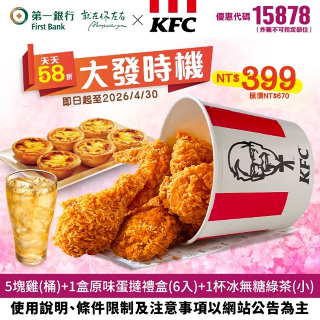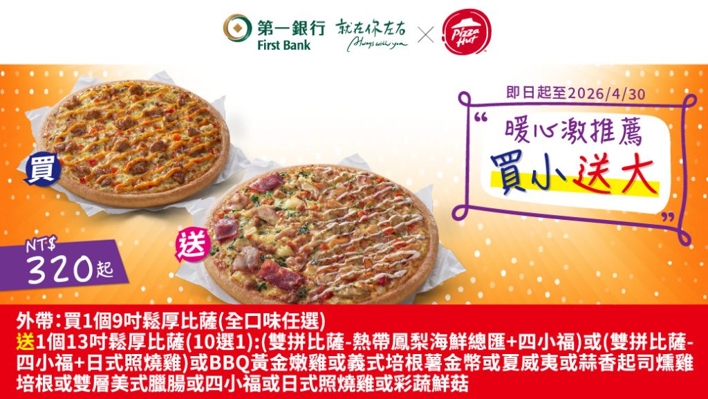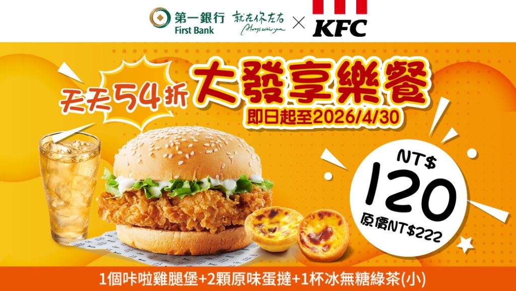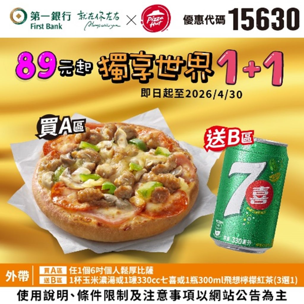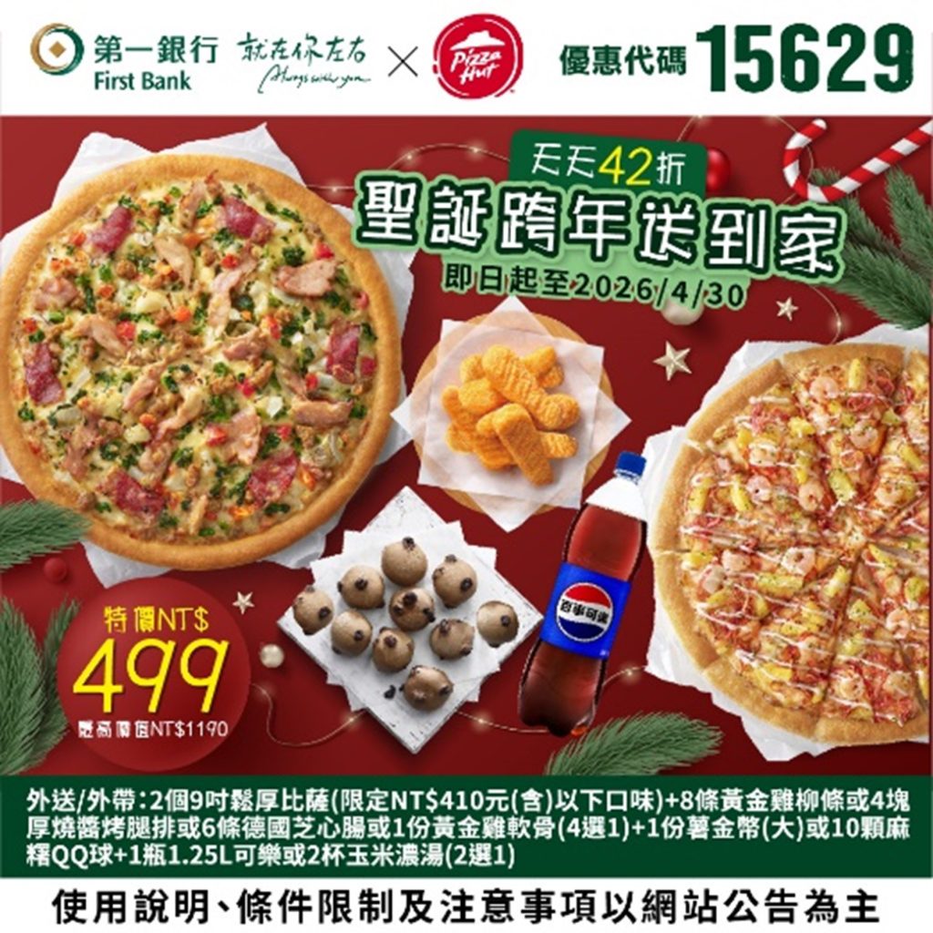 最新活動 第一新聞獅 【第一銀行X肯德基/必勝客】我請客你出優惠券!最新套餐折扣 「我請客你出錢,阿不是… 是你出優惠券!」 不管是聖誕、跨年還是農曆春節,炸雞比薩聚餐最實在!聚餐買小送大超划算,還有幸福獨享54折套餐~ By 小粉獅 / 2025-12-23 第一銀行X肯德基 天天54折 大發享樂餐(優惠期限至2026/4/30)【前往粉獅幣平台領取】【前往第一銀行官方LINE領取】 注意事項:1.請至肯德基官網「優惠券專區」 (https://www.kfcclub.com.tw/Coupon) 輸入16碼唯一性序號訂餐。2.此優惠套餐限官網訂購,門市現場不提供點餐服務(桃園台茂、屏東潮州、內湖金龍、新竹湖口餐廳、台北復興南餐廳不適用)。3.限正餐時段(10:30AM起供應)使用。如遇連續或特殊節慶(如跨年元旦、農曆新年、母親節、父親節、聖誕節等假期)將暫停使用此優惠,詳情以餐廳門市公告為主。4.本券不適用外送,其他內容請參閱共同注意事項。 第一銀行 X必勝客 暖心激推薦 買小送大(優惠期限至2026/4/30)【前往粉獅幣平台領取】【前往第一銀行官方LINE領取】 注意事項:1.請至必勝客官網兌換優惠(https://pse.is/pizzahut-v),或於右上角選單選取「優惠券兌換」中「輸入電子禮券序號」,於電子禮券專區輸入兌換序號訂購。16碼唯一性序號僅限使用一次,過期無效。此套餐需收費,方式請參考必勝客官網。2.門市現場不提供點餐服務,訂購專線412-9889,手機請加(02)。3.外帶/外送皆可,此套餐之比薩餅皮升級,須依門市加價規範加價,其他加價規範依門市公告及官網為準。外送服務為限區服務,購買商品實際付款金額滿$399,外送服務一律免費;購買商品實際付款金額未滿$399,酌收官網定價外送服務費用。 第一銀行X肯德基 天天58折 大發時機(優惠代碼:15878 本行客戶輸入代碼即享優惠,優惠期限至2026/4/30) 注意事項:1.請至肯德基官網「優惠券專區」(https://www.kfcclub.com.tw/Coupon)輸入優惠代碼查詢使用。若網購無法使用建議至門市點餐使用。2.本券可至肯德基餐廳使用(新竹湖口餐廳、台北復興南餐廳不適用),結帳時出示優惠券(或手機圖檔),如使用紙券後需回收。3.優惠代碼:15878,未告知代碼恕無法享此優惠,限正餐時段(10:30AM起供應)使用。4.本券不適用外送,其他內容請參閱共同注意事項。 第一銀行X肯德基 天天65折 聖誕跨年聚堡盒(優惠代碼:15879 本行客戶輸入代碼即享優惠,優惠期限至2026/4/30) 注意事項:請至肯德基官網「優惠券專區」(https://www.kfcclub.com.tw/Coupon)輸入優惠代碼查詢使用。若網購無法使用建議至門市點餐使用。本券可至肯德基餐廳使用(新竹湖口餐廳、台北復興南餐廳不適用),結帳時出示優惠券(或手機圖檔),如使用紙券後需回收。優惠代碼:15879,未告知代碼恕無法享此優惠,限正餐時段(10:30AM起供應)使用。本券不適用外送,其他內容請參閱共同注意事項。 第一銀行X肯德基 天天大方送 買蛋撻送套餐(優惠代碼:15880 本行客戶輸入代碼即享優惠,優惠期限至2026/4/30) 注意事項:1.請至肯德基官網「優惠券專區」(https://www.kfcclub.com.tw/Coupon)輸入優惠代碼查詢使用。若網購無法使用建議至門市點餐使用。2.本券可至肯德基餐廳使用(新竹湖口餐廳、台北復興南餐廳不適用),結帳時出示優惠券(或手機圖檔),如使用紙券後需回收。3.優惠代碼:15880,未告知代碼恕無法享此優惠,限正餐時段(10:30AM起供應)使用。4.本券不適用外送,其他內容請參閱共同注意事項。 第一銀行X必勝客 天天42折 聖誕跨年送到家(優惠代碼:15629 本行客戶輸入代碼即享優惠,優惠期限至2026/4/30) 注意事項:1.請至必勝客官網兌換優惠(https://pse.is/pizzahut-c),或於右上角選單選取「優惠券兌換」中「輸入活動代碼」,於五碼優惠專區輸入兌換代號訂購。進入訂購頁面後(http://www.pizzahut.com.tw)點選優惠券兌換下五碼優惠專區,輸入活動代碼訂購。若網購無法使用建議至門市點餐使用。2.優惠代碼:15629,未告知代碼恕無法享此優惠。訂購專線412-9889,手機請加(02)。3.外帶/外送皆可,此套餐之比薩餅皮升級,須依門市加價規範加價,其他加價規範依門市公告及官網為準。*外送服務為限區服務,購買商品實際付款金額滿$399,外送服務一律免費;購買商品實際付款金額未滿$399,酌收官網定價外送服務費用。 第一銀行X必勝客 89元起獨享世界1+1(優惠代碼:15630 本行客戶輸入代碼即享優惠,優惠期限至2026/4/30) 注意事項:1.請至必勝客官網兌換優惠(https://pse.is/pizzahut-c),或於右上角選單選取「優惠券兌換」中「輸入活動代碼」,於五碼優惠專區輸入兌換代號訂購。進入訂購頁面後(http://www.pizzahut.com.tw)點選優惠券兌換下五碼優惠專區,輸入活動代碼訂購。若網購無法使用建議至門市點餐使用。2.優惠代碼:15630,未告知代碼恕無法享此優惠。訂購專線412-9889,手機請加(02)。3.外帶/外送皆可,此套餐之比薩餅皮升級,須依門市加價規範加價,其他加價規範依門市公告及官網為準。外送服務為限區服務,購買商品實際付款金額滿$399,外送服務一律免費;購買商品實際付款金額未滿$399,酌收官網定價外送服務費用。 共同注意事項:肯德基相關優惠券:優惠不得同時併用,圖片僅供參考,產品以實物為準。炸雞部位恕不開放挑選,皆由門市人員搭配。如遇不可抗力或菜單簡化原物料短缺等因素,以致門市無法提供相關商品,肯德基有權以等值商品替代,詳情請以店內公告為主,肯德基保有修改活動辦法及