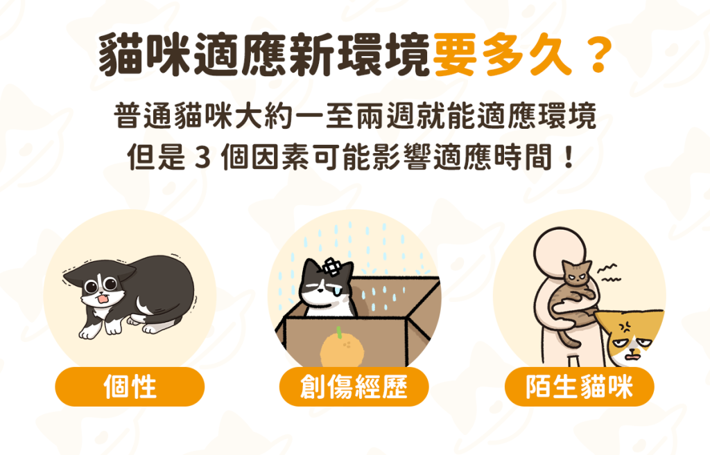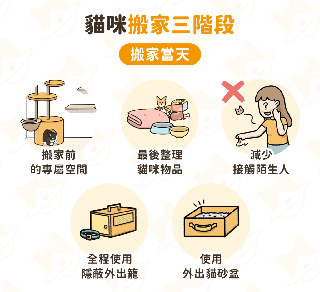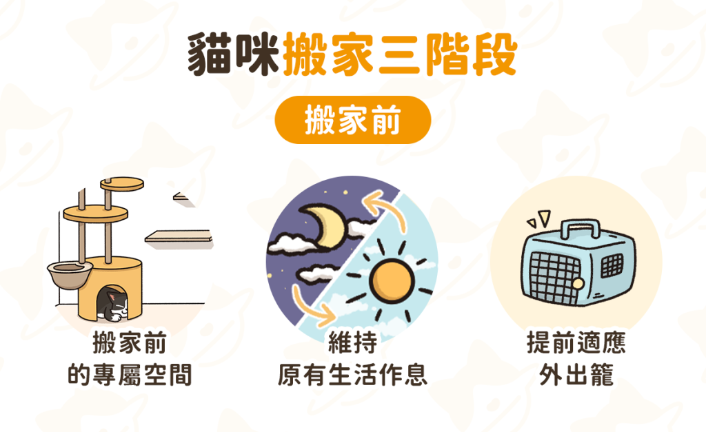 生活專題獅 貓咪適應新環境 SOP!搬家 3 階段建立安全感! By 小粉獅 / 2025-12-31 如何幫助貓咪適應新環境?搬家對於貓咪來說,是件壓力很大的事。高敏感的貓咪在新環境中容易感到緊張、焦慮,甚至頻繁叫喊、無法正常進食或排泄等。依據搬家時間分成三個階段,提前做好準備,才能幫助貓咪適應新的生活環境!(一)搬家前舊家留有貓咪固定的專屬空間,維持原本作息,不隨意移動日常用品,讓貓咪無法察覺家中變化。準備搬家時所需的外出籠,擺在活動空間,籠內放置帶有貓咪氣味的物品或放鬆小物,讓貓咪提早習慣外出籠。 (二)搬家當天貓砂盆、貓碗等貓咪日常用品,必須等到最後才能整理!全程使用安全、隱蔽的外出籠,減少貓咪與陌生人接觸。如果路途遙遠,可以準備外出式貓砂盆,滿足貓咪生理需求。 (三)搬家後新家優先為貓咪安排專屬空間,將主人的衣物或帶有舊家氣味的物品,擺放在貓咪的生活空間,打開外出籠,讓貓咪自行探索新環境。可以適度使用貓咪費洛蒙,幫助安定情緒。如果貓咪因焦慮而無法進食,可以用貓咪喜愛的罐頭、零食,引導貓咪放鬆進食。 貓咪適應新環境要多久?普通貓咪只需要一兩週就能適應新環境,但膽小怕生的個性、過往曾有創傷經歷,或新環境中有其他陌生貓咪等因素,都有可能延長適應時間。當遇到這些狀況時,要更密切注意貓咪的適應狀況,用愛和耐心,幫助毛孩在新家找到安全感! 延伸閱讀:【犬貓行為學】毛孩搭車焦慮怎麼辦?延伸閱讀:貓咪焦慮怎麼辦?訓練師教你 3 步驟正確紓壓汪喵星球,始終以毛孩為本。我們相信,毛孩就和小孩一樣,值得擁有最優質的選擇。因此,我們始終以毛孩的需求為出發點,從主食、零食、保健品到貓砂,持續打造極致、提供上百款貼近需求的產品,帶給毛孩幸福又健康的生活。汪喵星球更希望透過每一次的日常觀察,幫助毛拔麻了解毛孩喜好,讓毛孩過得更好,陪我們一起慢慢變老! 節錄自《貓咪適應環境要多久?貓咪搬家、適應新環境全攻略》。由汪喵星球授權轉載。 【第一銀行 X 中華電信Hami Point】Hami鬥陣iLEO!最高享2,200點Hami Point 立即了解更多 Tags: 生活時事 You may also like 狗狗淚痕怎麼清?了解成因、7 方法和淚痕說再見! By 小粉獅 / 2025-12-29 颱風、地震造成房屋毀損可以理賠嗎?全面解析房屋險保障重點 By 小粉獅 / 2025-12-15 如何讓兩隻貓和平相處?養第二隻貓必看 SOP! By 小粉獅 / 2025-12-05 狗狗吐怎麼辦?從嘔吐物顏色判斷可能原因、送醫時機! By 小粉獅 / 2025-12-01 2025 租賃條例修法懶人包:3 年租期保障、漲租限制,房價會降嗎? By 小粉獅 / 2025-11-16 文章導覽 狗狗淚痕怎麼清?了解成因、7 方法和淚痕說再見!