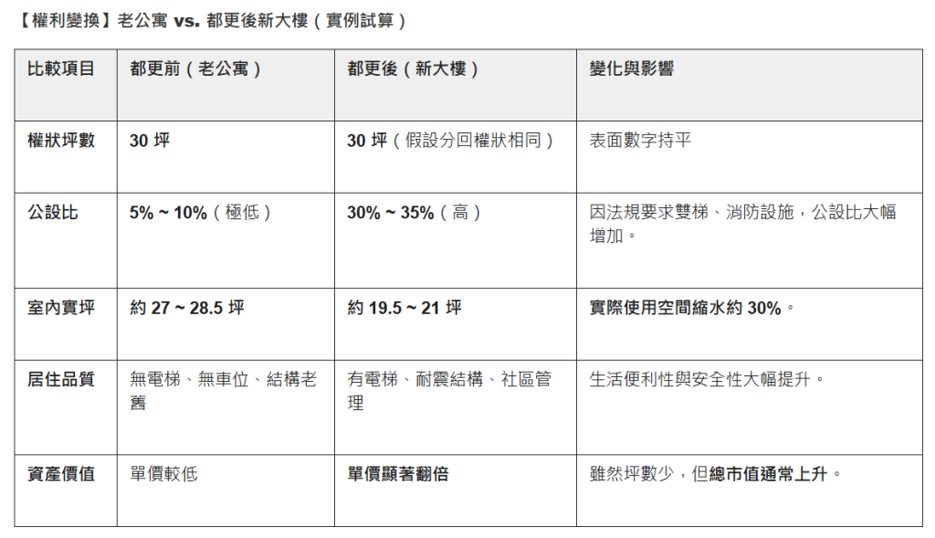 生活專題獅 買老宅投資都更值得嗎?3分鐘搞懂權利變換與估價,避免坪數縮水 中古屋雖然屋齡高,但生活機能完備,是投資客買入投資收租標的。若有都更,又能讓房屋價值翻倍。(圖片來源/藍浩勻) By 小粉獅 / 2026-01-12 在台灣房市中,「買老宅等都更」一直是熱門話題。許多投資者或自住客購入屋齡較高的物件,期待透過「都市更新」(簡稱都更)讓老屋變新屋,實現資產價值的翻倍增長。然而,都更絕非單純的「舊換新」,其背後涉及極為複雜的法規、精密的價值評估以及漫長的協商過程。本文將深度解析都更最核心的兩個關卡:「都更評定」與「權利變換」,並探討其中的風險與機會,助您釐清這場長期抗戰的真實面貌。 一、 都市更新的本質:不只是重建都市更新是依據《都市更新條例》,針對都市計畫範圍內老舊、機能退化或有安全疑慮的區域,進行有計畫的再開發。其目的不僅是改善個別住戶的居住環境,更在於提升整體的都市機能與公共利益。都更主要分為重建、整建、維護三種方式,但市場上最關注的通常是「重建」,因為其對房價的帶動效果最強。推動主體則分為政府主導的「公辦都更」、建商主導的「民辦都更」(最常見),以及住戶自行發起的「自辦都更」。 二、 第一關:都更評定——我的老宅有資格嗎?買了老宅,不代表就能參與都更。首先必須確認該物件是否符合法定的基本門檻。以下是判斷老宅是否具備都更潛力的關鍵指標:所在區域:必須位於「都市計畫區域」內(通常為住宅區或商業區)。屋齡與條件:通常需屋齡滿 30 年以上(並符合無電梯、巷道狹窄等環境指標);若是建築物經評估有結構安全疑慮(如海砂屋、輻射屋或嚴重損毀),則不受 30 年屋齡限制,甚至可適用迅行劃定。基地規模:都更單元面積原則上需達 1,000 平方公尺(約 302.5 坪)以上;若介於 500 至 1,000 平方公尺,則需經都更審議會特殊同意。小基地通常較難推動都更。環境指標:需符合地方政府劃定的標準,例如巷道狹窄影響救災、建築物耐震能力不足、居住環境惡劣等。如何確認? 您可透過內政部「全國土地使用分區資料查詢系統」確認土地分區,或至各縣市政府「都市更新處」網站查詢該區是否已被劃定為更新單元。 三、 第二關:權利變換——都更的核心機制都更過程中,屋主最關心的莫過於:「更新後我能分回多少房子或錢?」。這就涉及了都更最核心、也最複雜的機制——「權利變換」。1. 什麼是權利變換?簡單來說,就是將您「更新前的土地與建物價值」,經過精密的估價與計算,轉換成「更新後新大樓的應有部分(坪數與車位)」或現金補償。這是一個價值交換的過程,而非單純的「一坪換一坪」。延伸閱讀|都更條件是什麼?都更流程懶人包教你一坪換一坪2. 實例解析:為什麼新家室內變小了?許多人對都更有個誤解,認為「室內實坪」能一換一。但現代新法規要求設置雙逃生梯、消防設施、停車空間等,導致新大樓的「公設比」往往高達 30%~35% 以上。舉例來說:陳先生擁有一間權狀 30 坪的老公寓(公設比極低,通常僅 5%~10% 或更低,室內實坪大)。參與都更後,經過權利變換計算,他分回了權狀同樣是 30 坪的新大樓。但因為新大樓公設比高達 33%,他實際能使用的室內空間大約只剩下 20 坪左右。雖然室內變小,但房屋單價與總價值通常會顯著提升,且居住安全與品質大幅改善。地主必須在「資產價值增加」與「實際使用空間可能減少」之間做好心理準備。3. 關鍵的「估價機制」權利變換的公平性建立在「估價」之上。為了避免建商球員兼裁判,法規要求必須由實施者(建商)與地主共同指定,或由政府協助抽選出三家以上的獨立專業不動產估價師進行估價。估價師會評估更新前的土地價值、更新後的預期房價以及整體的營建成本,計算出每位地主應得的比例。 四、 風險與挑戰:都更路上的絆腳石都更雖然有容積獎勵與稅賦減免等誘因,但過程往往充滿荊棘,以下風險務必納入考量:1. 漫長的等待時間都更從整合意願、送件審議、拆除到完工,平均耗時至少 5-8 年,甚至長達 10 年以上。這段期間地主需自行租屋安置,時間與金錢成本不容小覷。2. 「釘子戶」與整合難題都更採多數決(一般地區需 4/5 同意),不需 100% 同意即可送件。然而,實務上常遇到不同意戶(俗稱釘子戶)。原因可能包含對估價結果不滿、情感依附、或要求過高的額外補償。解決機制:目前多以持續溝通協調為主。若進入權利變換階段仍有爭議,雖可申請政府調處,甚至《都市更新條例》賦予政府代為拆除的權限,但實務上政府執行代拆門檻極高且案例稀少,切勿過度依賴公權力介入,整合卡關仍是最大風險。3. 分配不如預期的風險若老宅位於非精華區,更新後房價漲幅有限,建商為了回收營建成本,必須分走較多坪數,導致地主分回的價值可能低於預期。 買老宅等都更的 3 大潛在風險(表格製作/藍浩勻) 結論:審慎評估,切勿盲從「買老宅等都更」是一項高潛力但也高風險的長期投資。在出手前,請務必先查詢該物件是否符合都更基本條件,並理解「權利變換」的價值分配邏輯。建議尋求專業的建築師、估價師或專門處理都更的律師諮詢,詳細評估時間成本與潛在風險,才能在這場老屋翻新的長期抗戰中立於不敗之地。※由於相關法規皆會隨時調整異動,本文所提及之稅務、法律細節僅供參考,實務操作時務必以政府