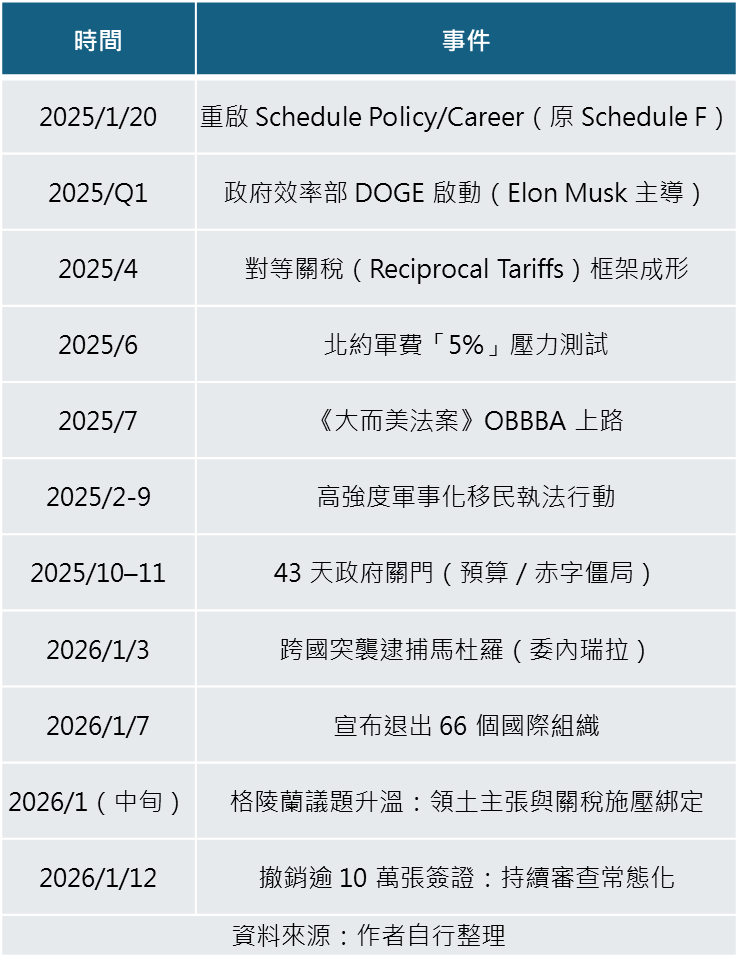 川普第二任期自 2025 年 1 月 20 日開始,至 2026 年 1 月 20 日屆滿一週年。與第一任期相比,川普 2.0 的政策節奏更快、手段更強硬,且高度依賴行政命令先行、法規與司法戰跟上的模式:國內端重整行政體系與移民制度;經濟端以關稅與產業政策重塑供應鏈;外交端則用交易式手段重新談盟友責任與地緣優先順序。但問題是,這些變化真的只是「美國內政」嗎?它們是否正在改變全球供應鏈配置、資本流向與產業風險溢價?又有哪些政策,看似政治操作,實則會直接影響投資決策?