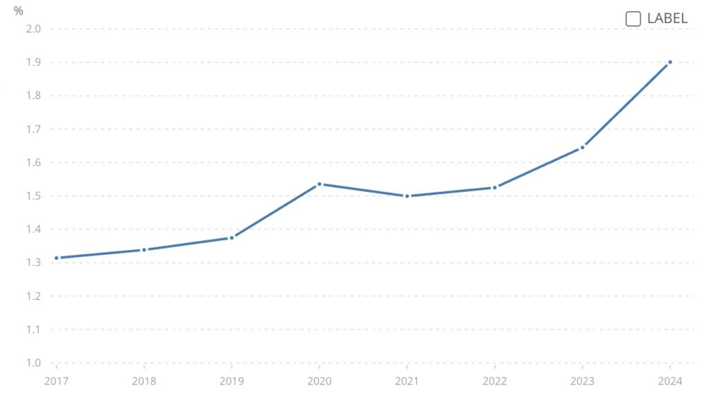 從圖中可以看到,歐盟的軍事支出占 GDP 比例,長期大致落在 1.3%~1.6% 區間,直到近年地緣政治風險升高,才逐步向 2% 靠攏。即使在俄烏戰爭後,歐洲也只是勉強接近原本的北約共識目標。