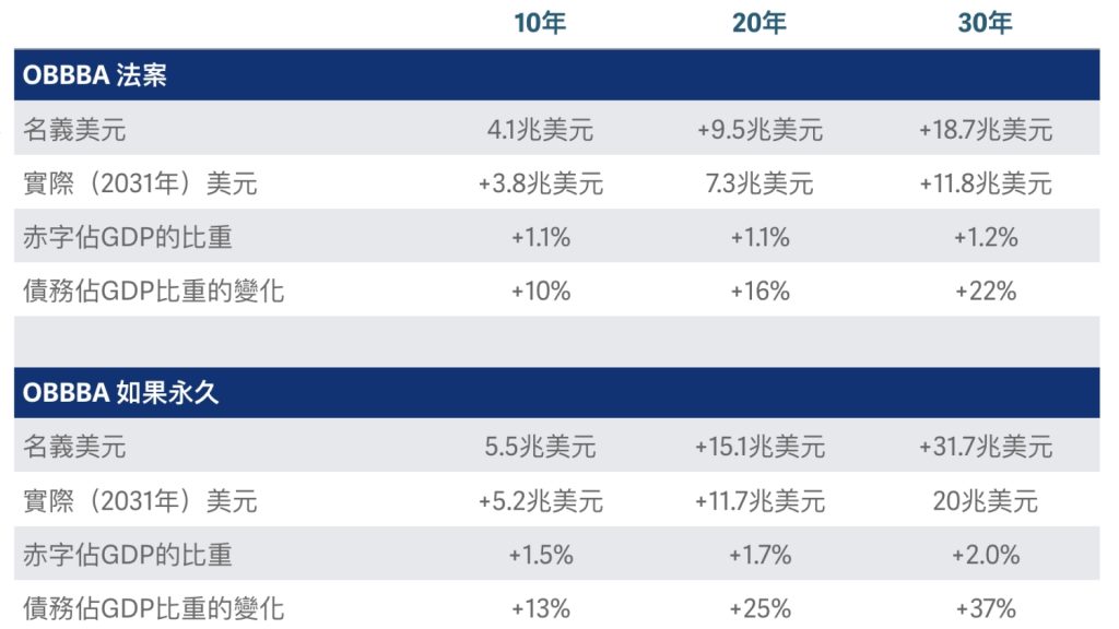 根據國會預算辦公室(CBO)的估算, OBBBA 將在 2034 年之前將債務增加約 4.1 兆美元;在未來 30 年內將債務增加 19 兆美元;如果法案永久生效,則將增加 32 兆美元。
