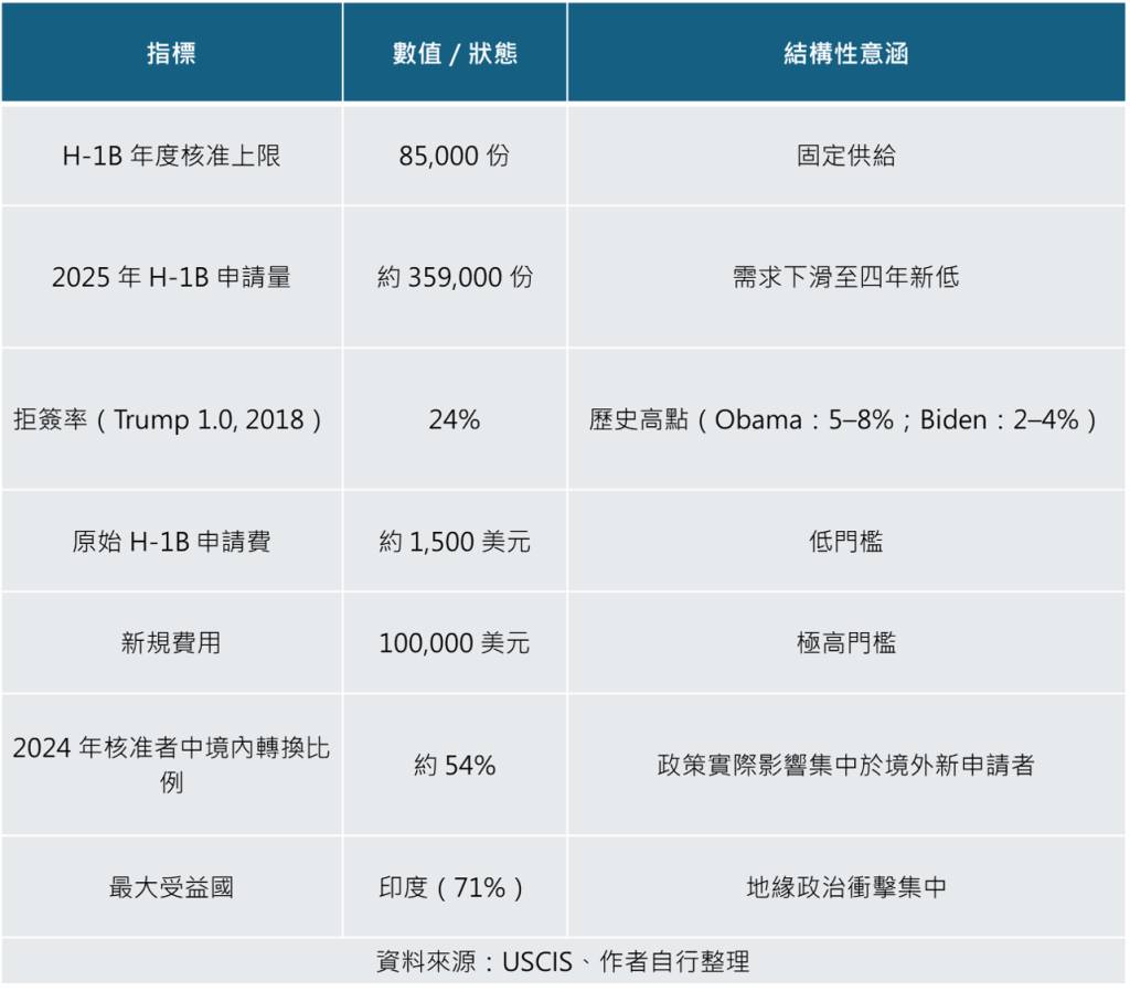 以下表格整理了 H-1B 與相關制度轉向中,最具結構性意義的幾個指標: