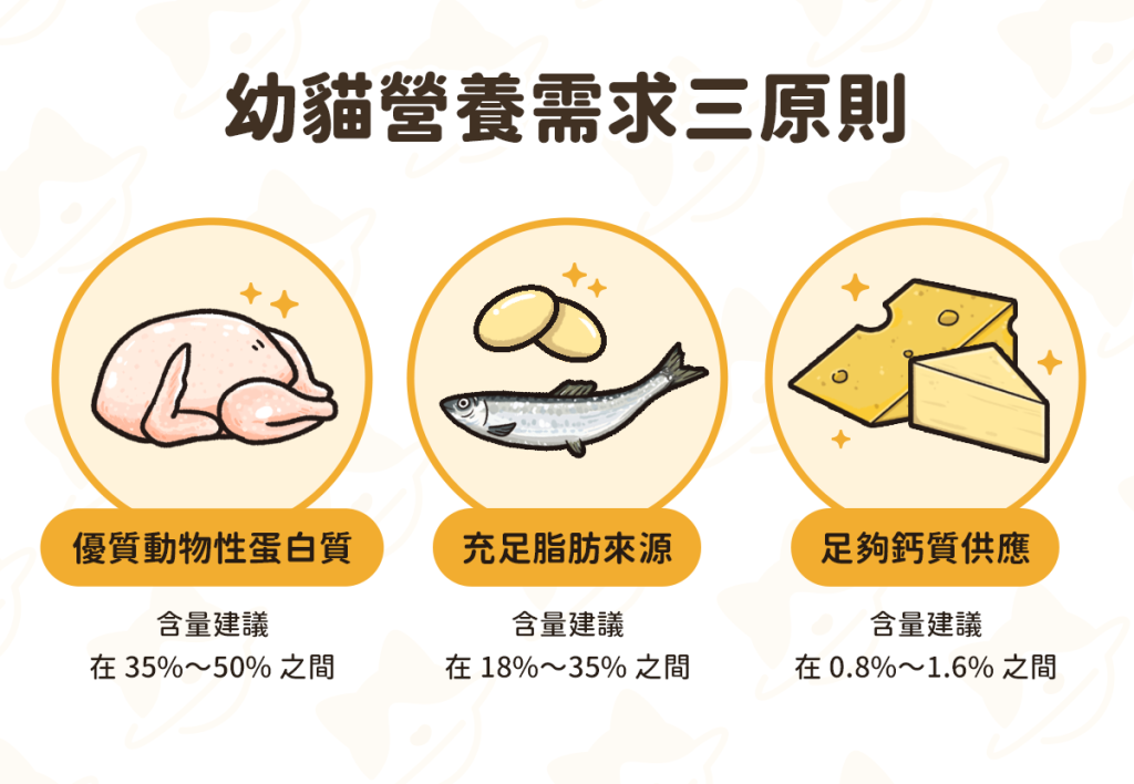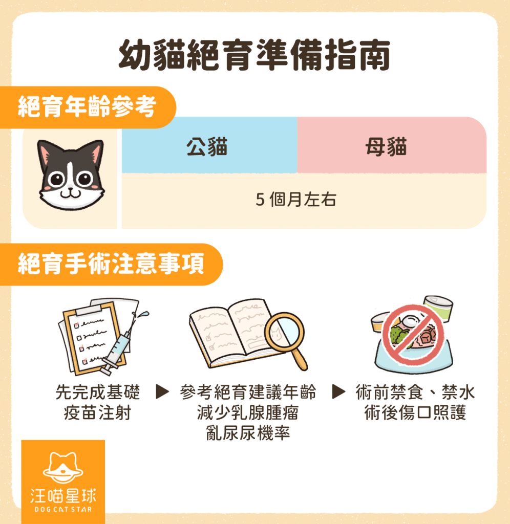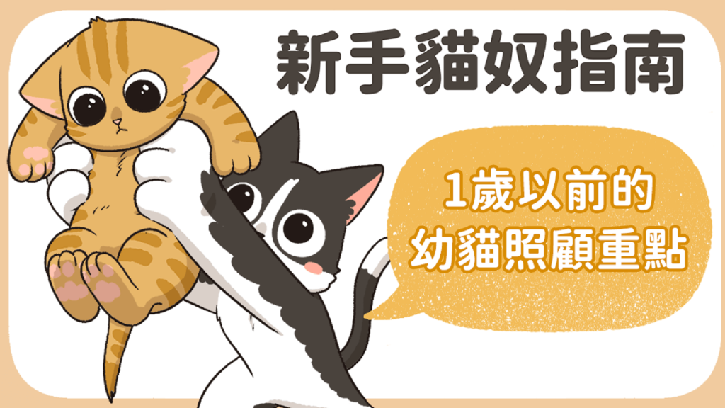 生活專題獅 幼貓照顧怎麼開始?飲食、疫苗與環境準備一次看懂! 家裡來了一隻幼貓,從牠剛出生到滿一歲,每個階段照顧重點都不一樣。這篇會把零到十二個月分成幾個時期,把飲食、疫苗、結紮、環境布置等重點整理給新手家長。 By 小粉獅 / 2026-04-29 奶貓期:剛出生到一個月 沒有貓媽媽照顧的奶貓,需要花費大量心力。飲食、排泄、保溫是這個階段的三大重點。飲食:選貓專用配方奶奶貓不能喝牛奶或羊奶,乳糖含量太高容易拉肚子。建議用貓專用配方奶粉,營養比例針對奶貓設計。餵的時候讓牠正面趴著、頭部稍微抬高,不要躺著喝會嗆到。餵食頻率:一到二週齡每兩到三小時餵一次(一天 6-8 次);三週齡之後可拉長到四小時一次(一天 4-6 次)。排泄:手動刺激沒滿月的奶貓不會自己上廁所,原本是貓媽媽舔屁股協助。家長可用棉花或紙巾沾溫水,輕擦肛門和尿道口。每天會尿尿,但因食量小,2-3 天大便一次正常。一個月大左右可開始訓練貓砂盆。環境:保溫最重要剛出生的奶貓無法自己維持體溫。環境溫度建議:一週齡 29-32 度、兩週齡 27 度以上、三週齡 24 度以上。可用保溫燈或保溫箱,鋪軟毛毯讓牠睡飽。如果出現不吃不喝、整天睡的狀況要盡快就醫。離乳期:一個月到三個月幼貓開始長乳牙,可以慢慢斷奶。這時期是成長最快的階段,營養特別重要。三大營養需求蛋白質含量建議 35-50%(乾物比),來源以動物性為主;脂肪建議 18-35%;鈣質建議 0.8-1.6%。不要自己亂補鈣,過多過少都會影響鈣磷比,造成骨骼發育問題。漸進式斷奶第四週開始給奶水加少量離乳食品,比例隨週齡逐漸調整:第五週改 3/4 奶水加 1/4 離乳食品;第六週離乳食品超過一半;第六到八週可吃固態食物,正式斷奶。離乳食品建議選擇「未來想當主食的東西」,讓幼貓提前適應。雞肉泥可當零食但不能當主食(每天熱量不超過 10%)。泡軟飼料可過渡,但乾糧水分少不適合長期單一食用。泥狀主食罐是理想選擇,水分跟營養都夠。飼料挑選原則 貓本身不愛喝水,主食建議以濕食或乾濕混合為主。挑選時認明:包裝有 AAFCO 或 NRC 標準認證標示「幼貓專用」或「全齡期適用」蛋白質含量大於 30%,且來源為動物性食材來源清楚(避免「肉類」「動物性脂肪」這種模糊描述)另外要注意主食罐和零食罐的差別,挑錯會造成營養不良。驅蟲與疫苗驅蟲:2-3 週齡時可諮詢獸醫師,約兩個月大開始可用驅蟲產品。常見外寄生蟲有跳蚤、壁蝨、耳疥蟲;內寄生蟲有心絲蟲、蛔蟲等。第一次選用建議直接問獸醫師。疫苗:6-8 週齡可開始施打。常見有三合一、四合一、五合一,純室內貓三合一通常足夠,會接觸戶外或流浪貓的需打五合一。具體選擇請諮詢獸醫師。換牙期:三個月到五個月四個月前是乳齒,之後逐漸被永久齒取代。換牙時牙齦輕微紅腫流血是正常的。乳齒和永久齒可能同時存在,牙縫容易卡細菌形成牙垢,從小養成刷牙習慣可減少未來牙周問題。這階段精力非常旺盛,可準備互動型玩具(逗貓棒、貓草包)培養感情;功能型玩具(蟲癭果、木天蓼、貓抓板)讓幼貓啃咬磨牙、放鬆紓壓;環境布置可加紙箱、貓抓板、貓咪隧道、貓跳台豐富空間。換毛期:五個月到七個月 絕育時機「結紮」較正確的說法是「絕育」。絕育前最好完成基礎疫苗。國外獸醫建議五個月就可手術,但每隻狀況不同,最終要與獸醫師討論。絕育可避免意外懷孕、降低乳腺腫瘤機率、減少公貓亂尿尿與攻擊行為。手術前需禁食禁水。換毛照護幼貓約六個月開始換毛。理毛時會吃下毛髮,累積在腸道易吐毛或便秘。建議每天用寵物專用梳清廢毛,並補充天然植物纖維(排毛粉、新鮮小麥草)幫助腸道蠕動。不建議化毛膏,它靠礦物油潤滑腸道、含反式脂肪和人工添加,長期負擔大。剪指甲技巧 指甲太長會抓傷家長和自己,嚴重時會刺進肉墊。剪時輕壓肉墊和指頭中間擠出指甲,避開粉紅色血管處(有神經)。下刀至少離血管 2mm,方向要正確避免碎裂。前腳五隻、後腳四隻,每隻都要剪。轉成貓期:七個月到一歲飲食轉換絕育後代謝變慢,容易變胖是真的。每天定時定量分 2-3 餐或少量多餐,不要吃到飽。一歲左右可漸進轉成貓飼料,建議以高蛋白、低碳水濕食為主(主食罐、生食或副食罐補水),維持泌尿道健康。活動空間與心理需求貓不像狗那麼需要戶外,但需要垂直活動空間。貓跳台建議高度大於 180cm、檯面寬穩、材質為木質加摩擦力布料。家裡的衣櫥、書櫃、冰箱上方也都可以利用。關於「貓可以自己在家多久」這件事——研究指出貓對主人有依賴和情感連結。一般成貓不建議超過兩天,幼貓、老貓、病貓不建議超過一天。出遠門可請寵物保母或寵物旅館。清潔劑挑選貓會長時間接觸家中物品(棉被、睡窩、碗盤),清潔劑成分有刺激性會危害健康。挑選原則:避免精油、香精(茶樹、柑橘、尤加利對貓有毒)避免漂白水、酚類等強刺激消毒劑選溫和介面活性劑(如月桂基葡糖苷、SCS)汪喵星球,始終以毛孩為本。 我們相信,毛孩就和小孩一樣,值得擁有最優質的選擇。因此,我們始終以毛孩的需求為出發點,從主食、零食、保健品到貓砂,持續打造極致、提供上百款貼近需求的產品,帶給毛孩幸福又健康的生活。汪喵星球更希望透過每一次的日常觀察,幫助毛拔麻了解毛孩喜好,讓毛孩過得更好,陪我們一起慢慢變老! 節錄自《幼貓照顧怎麼上手?2026 新手